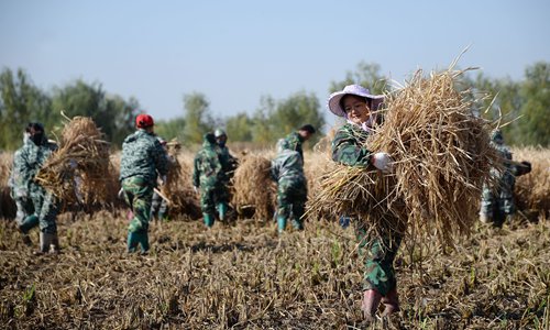 Researchers harvest super hybrid rice on Monday at a demonstration base of the Hebei Silicon Valley Academy of Agricultural Sciences in Yongnian district, Handan city, North China's Hebei Province.Photo: VCG