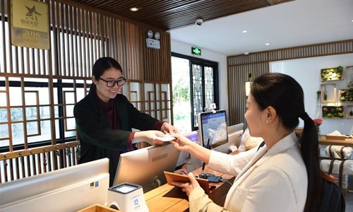 A tourist (R) checks in at a hotel within Tongli ancient town in Wujiang District of Suzhou, east China's Jiangsu Province, Oct. 31, 2018. Boasting rich tourism resources in ancient towns like Tongli, Wujiang District in recent years made efforts to integrate them with various elements such as local cultures and natural views to help boost local tourism. (Xinhua/Li Bo)