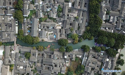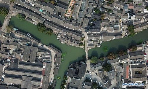 Aerial photo taken on Oct. 31, 2018 shows the scenery of Tongli ancient town in Wujiang District of Suzhou, east China's Jiangsu Province. Boasting rich tourism resources in ancient towns like Tongli, Wujiang District in recent years made efforts to integrate them with various elements such as local cultures and natural views to help boost local tourism. (Xinhua/Li Bo)