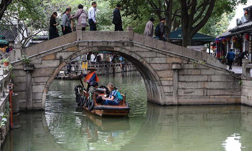 Tourists visit the Tongli ancient town in Wujiang District of Suzhou, east China's Jiangsu Province, Oct. 31, 2018. Boasting rich tourism resources in ancient towns like Tongli, Wujiang District in recent years made efforts to integrate them with various elements such as local cultures and natural views to help boost local tourism. (Xinhua/Li Bo)
