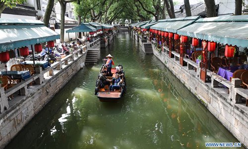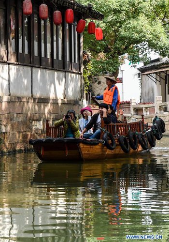 Tourists go sightseeing on a boat within Tongli ancient town in Wujiang District of Suzhou, east China's Jiangsu Province, Oct. 31, 2018. Boasting rich tourism resources in ancient towns like Tongli, Wujiang District in recent years made efforts to integrate them with various elements such as local cultures and natural views to help boost local tourism. (Xinhua/Li Bo)