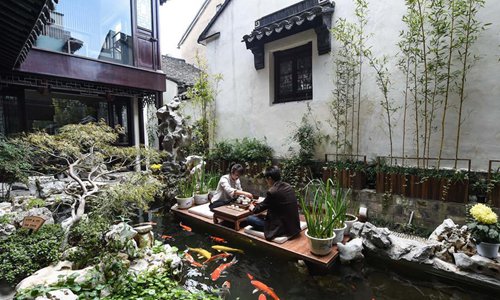 Tourists enjoy tea at a guesthouse within Tongli ancient town in Wujiang District of Suzhou, east China's Jiangsu Province, Oct. 31, 2018. Boasting rich tourism resources in ancient towns like Tongli, Wujiang District in recent years made efforts to integrate them with various elements such as local cultures and natural views to help boost local tourism. (Xinhua/Li Bo)