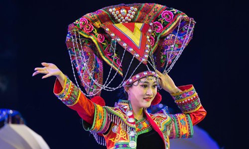 An actress performs during a show mixing music, dance and costume of the Yi ethnic group from Yunnan's Chuxiong Yi Autonomous Prefecture at the National Theatre of the China Ethnic Song and Dance Ensemble in Beijing, capital of China, on Nov. 2, 2018. (Xinhua/Wu Kaixiang)