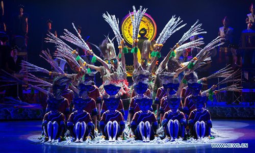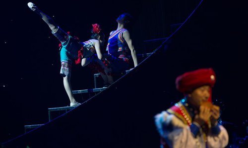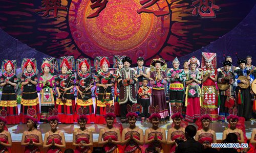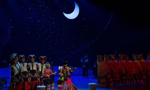 Actors perform during a show mixing music, dance and costume of the Yi ethnic group from Yunnan's Chuxiong Yi Autonomous Prefecture at the National Theatre of the China Ethnic Song and Dance Ensemble in Beijing, capital of China, on Nov. 2, 2018. (Xinhua/Wu Kaixiang)