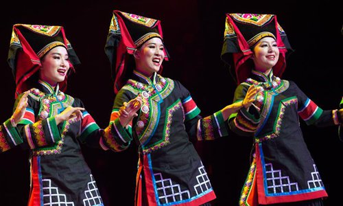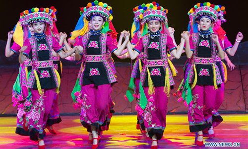 Actresses perform during a show mixing music, dance and costume of the Yi ethnic group from Yunnan's Chuxiong Yi Autonomous Prefecture at the National Theatre of the China Ethnic Song and Dance Ensemble in Beijing, capital of China, on Nov. 2, 2018. (Xinhua/Wu Kaixiang)