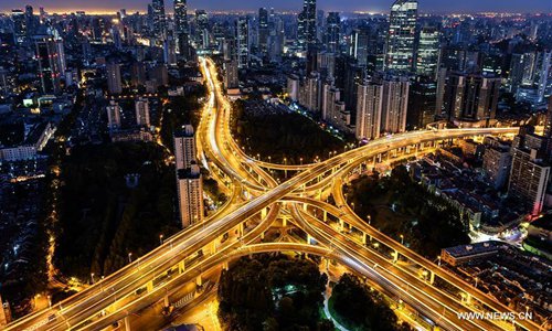 Photo taken on Nov. 2, 2018 shows an illuminated flyover in Shanghai, east China. The first China International Import Expo (CIIE) will be held on Nov. 5-10 in Shanghai. (Xinhua/Li Xin)