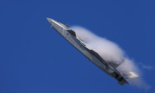 China's J-20 stealth fighter jet displays its new coating of stealth material and flies over the exhibition hall at Airshow China 2018 on Tuesday. Photo: Cui Meng/GT