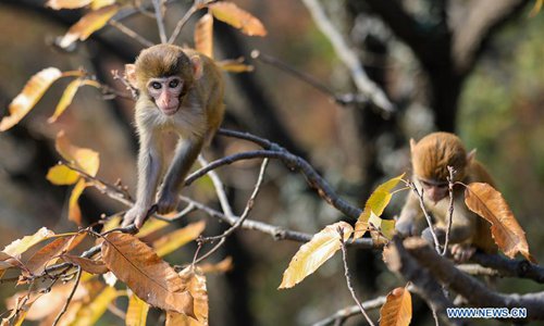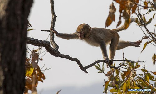 A monkey climbs up a tree at Huaguo Mountain Scenic Area in Lianyungang, east China's Jiangsu Province, Nov. 10, 2018. (Xinhua/Si Wei)