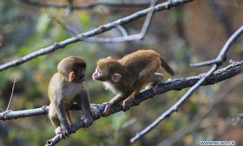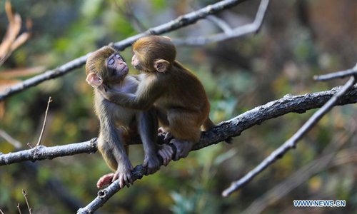 Monkeys play on a tree at Huaguo Mountain Scenic Area in Lianyungang, east China's Jiangsu Province, Nov. 10, 2018. (Xinhua/Si Wei)