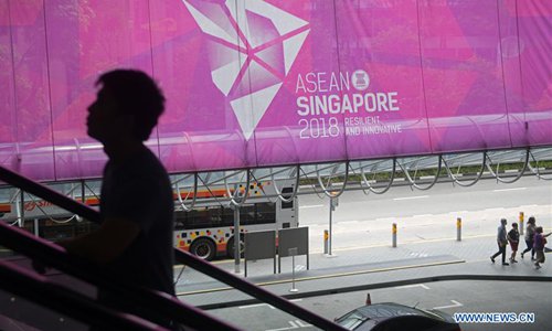 A signboard about Association of Southeast Asian Nations (ASEAN) Summit is seen in Suntec Singapore Convention & Exhibition Centre in Singapore on Nov. 12, 2018. (Xinhua/Li Gang)