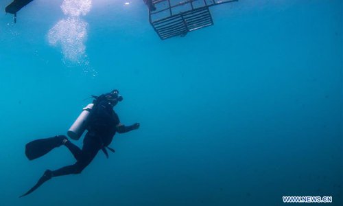 A diving instructor is seen in the sea at the Fenjiezhou Island scenic area in Lingshui Li Autonomous County, south China's Hainan Province, Nov. 19, 2018. Apart from leading groups of tourists on underwater excursions, some 100 diving instructors here also volunteer to help with coral reefs maintenance activities, such as transplanting corals to the designated restoration areas. Now the coral coverage reaches 13.16 percent at the scenic area and 30 percent to 40 percent at the diving area. (Xinhua/Yang Guanyu)