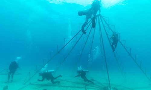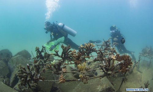 Diving instructors and staff members set up stands for corals in the sea at the Fenjiezhou Island scenic area in Lingshui Li Autonomous County, south China's Hainan Province, Sept. 6, 2017. Apart from leading groups of tourists on underwater excursions, some 100 diving instructors here also volunteer to help with coral reefs maintenance activities, such as transplanting corals to the designated restoration areas. Now the coral coverage reaches 13.16 percent at the scenic area and 30 percent to 40 percent at the diving area. (Xinhua)