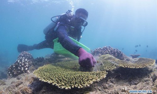 A diving instructor clears the debris off corals in the sea at the Fenjiezhou Island scenic area in Lingshui Li Autonomous County, south China's Hainan Province, Nov. 18, 2018. Apart from leading groups of tourists on underwater excursions, some 100 diving instructors here also volunteer to help with coral reefs maintenance activities, such as transplanting corals to the designated restoration areas. Now the coral coverage reaches 13.16 percent at the scenic area and 30 percent to 40 percent at the diving area. (Xinhua/Yang Guanyu)