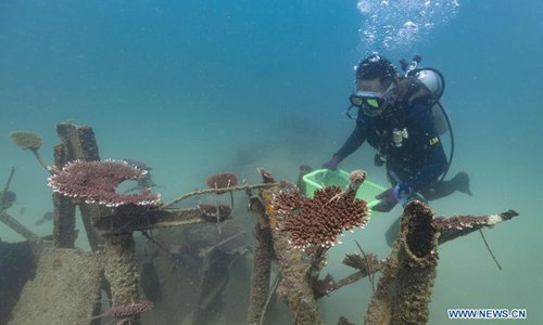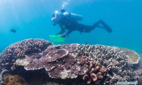 A diving instructor checks the growth of corals in the sea at the Fenjiezhou Island scenic area in Lingshui Li Autonomous County, south China's Hainan Province, Nov. 18, 2018. Apart from leading groups of tourists on underwater excursions, some 100 diving instructors here also volunteer to help with coral reefs maintenance activities, such as transplanting corals to the designated restoration areas. Now the coral coverage reaches 13.16 percent at the scenic area and 30 percent to 40 percent at the diving area. (Xinhua/Yang Guanyu)