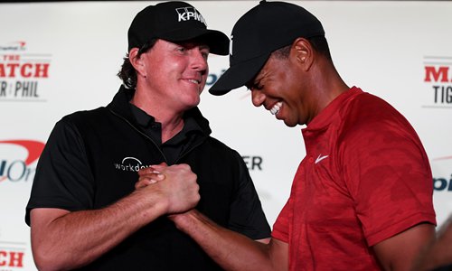 Phil Mickelson (left) and Tiger Woods shake hands during a press conference before "The Match" at Shadow Creek Golf Course on Tuesday in Las Vegas, Nevada. Photo: VCG