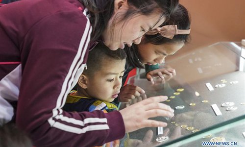 Visitors look at the commemorative coins during a major exhibition to commemorate the 40th anniversary of China's reform and opening-up at the National Museum of China in Beijing, capital of China, Nov. 24, 2018. (Xinhua/Yin Gang)