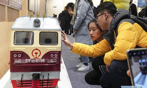 Visitors look at the model of locomotive during a major exhibition to commemorate the 40th anniversary of China's reform and opening-up at the National Museum of China in Beijing, capital of China, Nov. 24, 2018. (Xinhua/Yin Gang)
