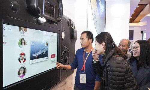Visitors experience customized postcard making at the exhibition area of Xinhua News Agency during a major exhibition to commemorate the 40th anniversary of China's reform and opening-up at the National Museum of China in Beijing, capital of China, Nov. 24, 2018. (Xinhua/Yin Gang)