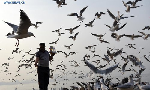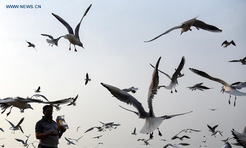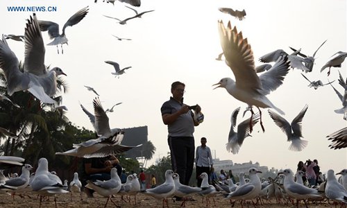 A man feeds seagulls as they fly over the Arabian Sea coast in Mumbai, India, Dec. 2, 2018. (Xinhua/ Stringer)