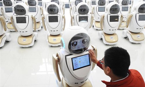 A staff member debugs a batch of commercial service robots at the Haizhou economic development zone in Lianyungang, east China's Jiangsu Province, Dec.4, 2018. (Xinhua/Geng Yuhe)