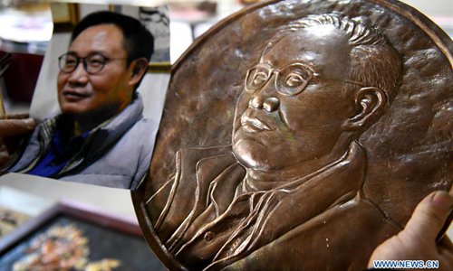 Guo Hailong, inheritor of welding-aided iron relief handicraft, checks a bust relief ordered by a customer at his workshop in Deming acient town of Shijiazhuang, capital of north China's Hebei Province, on Dec. 4, 2018. The craftsmanship was listed as the provincial intangible cultural heritage in 2013. (Xinhua/Chen Qibao)