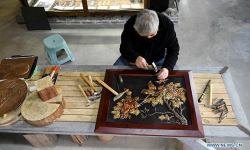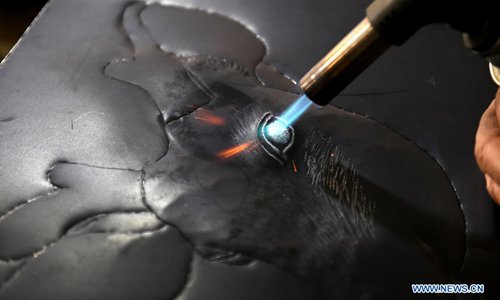 Guo Hailong, inheritor of welding-aided iron relief handicraft, works at his workshop in Deming acient town of Shijiazhuang, capital of north China's Hebei Province, on Dec. 4, 2018. The craftsmanship was listed as the provincial intangible cultural heritage in 2013. (Xinhua/Chen Qibao)