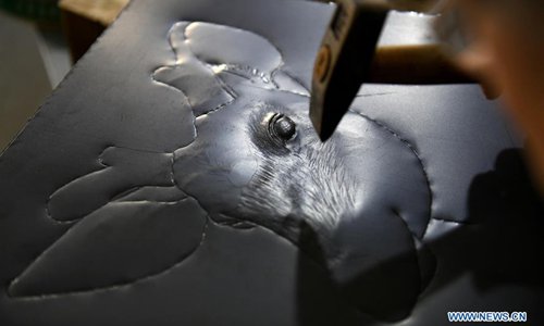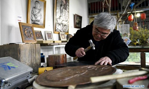 Guo Hailong, inheritor of welding-aided iron relief handicraft, works on an iron board at his workshop in Deming acient town of Shijiazhuang, capital of north China's Hebei Province, on Dec. 4, 2018. The craftsmanship was listed as the provincial intangible cultural heritage in 2013. (Xinhua/Chen Qibao)