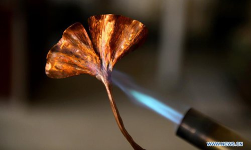 Guo Hailong, inheritor of welding-aided iron relief handicraft, makes an iron ginkgo leaf at his workshop in Deming acient town of Shijiazhuang, capital of north China's Hebei Province, on Dec. 4, 2018. The craftsmanship was listed as the provincial intangible cultural heritage in 2013. (Xinhua/Chen Qibao)