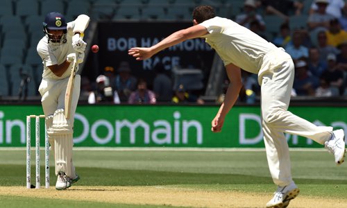 India's batsman Cheteshwar Pujara (left) plays a shot off Australia's paceman Josh Hazlewood during Day 1 of the first cricket Test match at the Adelaide Oval on Thursday in Adelaide, Australia. Photo: AFP