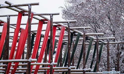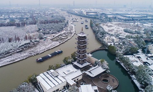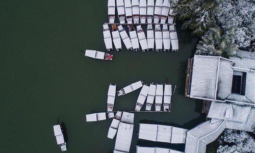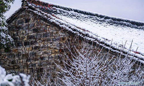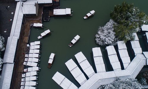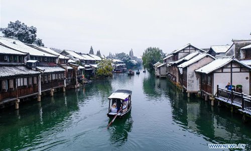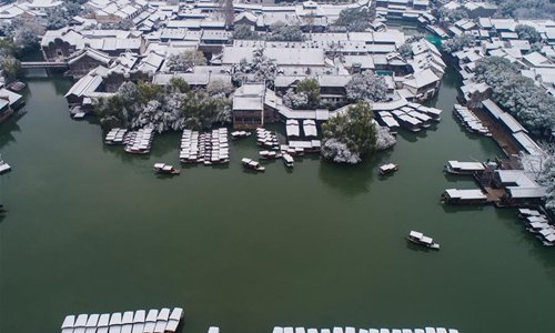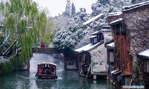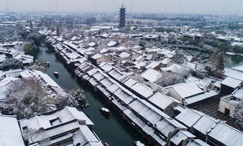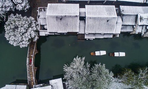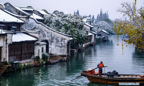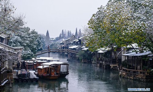 Photo taken on Dec. 9, 2018 shows the snow scenery in Wuzhen of Tongxiang, east China's Zhejiang Province. The ancient town Wuzhen greeted a heavy snow due to a cold front which brought large-scale snowfall in Tongxiang of Zhejiang. (Xinhua/Xu Yu)