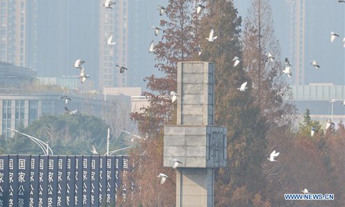 Photo taken on Dec. 13, 2018 shows pigeons flying during the state memorial ceremony for China's National Memorial Day for Nanjing Massacre Victims at the memorial hall for the massacre victims in Nanjing, east China's Jiangsu Province. (Xinhua/Ji Chunpeng)