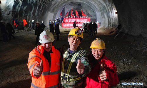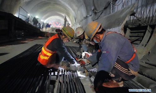 Workers build the New Badaling tunnel of the Beijing-Zhangjiakou high-speed rail line in Beijing, capital of China, Dec. 13, 2018. Workers have achieved a major breakthrough in the Beijing-Zhangjiakou high-speed rail line project, after they dug through the New Badaling tunnel, a pivotal part along the line, on Thursday. (Xinhua/Xing Guangli)