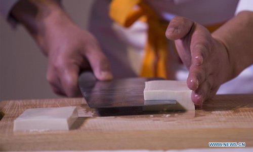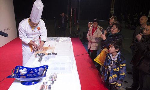 A Chinese cook performs cutting techniques during the Chinese Food Culture Festival in Bern, capital of Switzerland, on Dec. 16, 2018. The first Chinese Food Culture Festival was held on Sunday inside the Bernexpo here in the Swiss Capital, drawing more than 1,000 local residents in the festive Christmas season. Visitors enjoyed Chinese snacks as well as traditional performances including calligraphy, folk songs and martial arts, during the day-long festival supported by the Chinese Embassy and sponsored by various local associations. (Xinhua/Xu Jinquan)