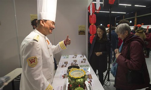 A Chinese cook introduces Huaiyang Cuisine to visitors during the Chinese Food Culture Festival in Bern, capital of Switzerland, on Dec. 16, 2018. The first Chinese Food Culture Festival was held on Sunday inside the Bernexpo here in the Swiss Capital, drawing more than 1,000 local residents in the festive Christmas season. Visitors enjoyed Chinese snacks as well as traditional performances including calligraphy, folk songs and martial arts, during the day-long festival supported by the Chinese Embassy and sponsored by various local associations. (Xinhua/Xu Jinquan)
