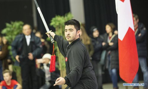 A young man performs Chinese martial arts during the Chinese Food Culture Festival in Bern, capital of Switzerland, on Dec. 16, 2018. The first Chinese Food Culture Festival was held on Sunday inside the Bernexpo here in the Swiss Capital, drawing more than 1,000 local residents in the festive Christmas season. Visitors enjoyed Chinese snacks as well as traditional performances including calligraphy, folk songs and martial arts, during the day-long festival supported by the Chinese Embassy and sponsored by various local associations. (Xinhua/Xu Jinquan)