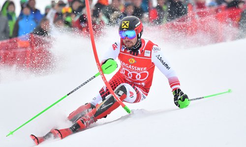 Marcel Hirscher of Austria competes in the first run of the men's slalom event of the ski world cup in Saalbach, Austria on Thursday. Photo: AFP