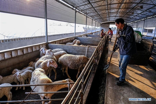 A farmer feeds sheep at a sheep-breeding company in Lyushan Town of Changxing County, east China's Zhejiang Province, Dec. 23, 2018. A company with 9,000 Hu sheep in Changxing has been developed into a poverty-alleviation base as local government encourages farmers to shake off poverty through raising the sheep. (Xinhua/Xu Yu)