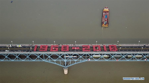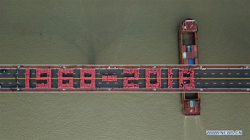 Representatives of citizens form a pattern reading "1968-2018" on the renovated Nanjing Yangtze River Bridge in Nanjing, east China's Jiangsu Province, Dec. 24, 2018. Built half a century ago, the Nanjing Yangtze River Bridge is China's first double-decked road-rail truss bridge. It will reopen to road traffic by the end of December after a 27-month renovation. (Xinhua/Li Bo)