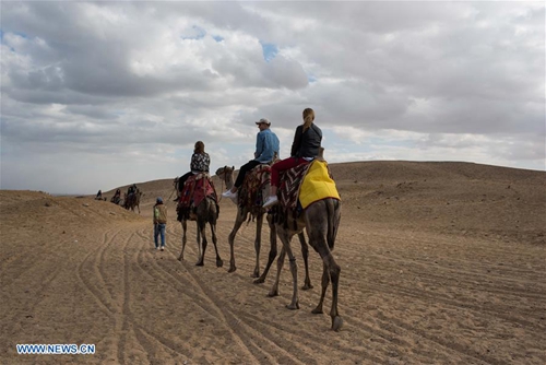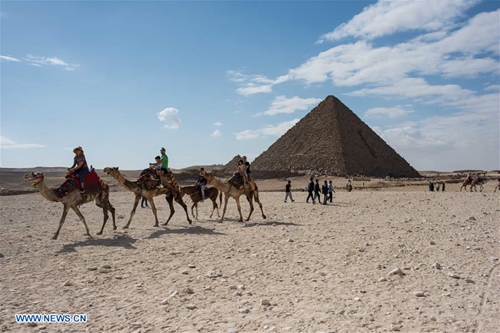 Tourists ride camels at the Giza Plateau near the Great Pyramids in Giza, Egypt, Dec. 26, 2018. (Xinhua/Meng Tao)