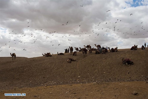 Camels are seen at the Giza Plateau near the Great Pyramids in Giza, Egypt, Dec. 26, 2018. (Xinhua/Meng Tao)