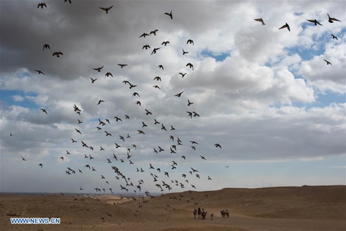 Pigeons fly over the Giza Plateau near the Great Pyramids in Giza, Egypt, Dec. 26, 2018. (Xinhua/Meng Tao)