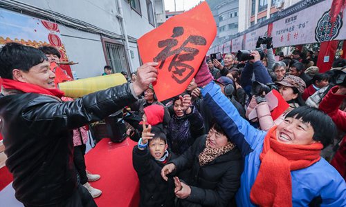 A villager receives a Chinese character "Fu", which means good luck, writen on a red diamond-shaped piece of paper in Zitong Town of Chun'an County, Hangzhou City, east China's Zhejiang Province, Dec. 30, 2018. Zitong, a town locally known for its tradition in Chinese painting and calligraphy, held activities on Sunday to celebrate the upcoming new year. (Xinhua/Xu Yu)