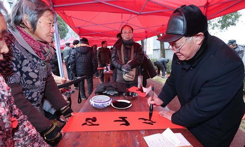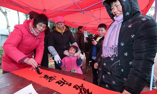 A local calligrapher writes spring couplets for villagers in Zitong Town of Chun'an County, Hangzhou City, east China's Zhejiang Province, Dec. 30, 2018. Zitong, a town locally known for its tradition in Chinese painting and calligraphy, held activities on Sunday to celebrate the upcoming new year. (Xinhua/Xu Yu)