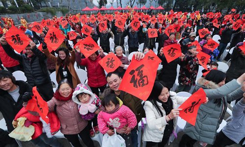 Villagers pose for a group photo with Chinese character "Fu", which means good luck, writen on red diamond-shaped pieces of paper in their hands in Zitong Town of Chun'an County, Hangzhou City, east China's Zhejiang Province, Dec. 30, 2018. Zitong, a town locally known for its tradition in Chinese painting and calligraphy, held activities on Sunday to celebrate the upcoming new year. (Xinhua/Xu Yu)