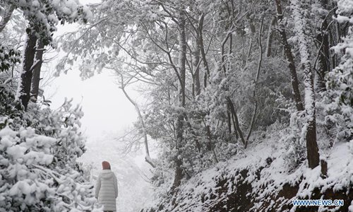 A woman views snow scenery at Longshan Park in Shaoxing City, east China's Zhejiang Province, Dec. 31, 2018. Snowfall and sleet hit Zhejiang Monday. (Xinhua/Weng Xinyang)