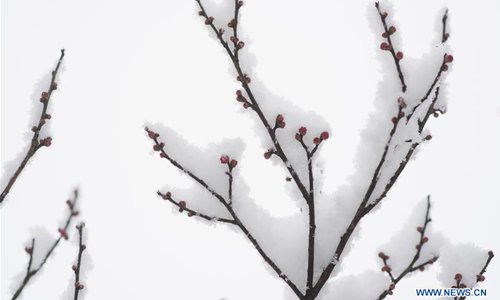 Photo taken on Dec. 31, 2018 shows budding red plum in snow at Longshan Park in Shaoxing City, east China's Zhejiang Province. Snowfall and sleet hit Zhejiang Monday. (Xinhua/Weng Xinyang)