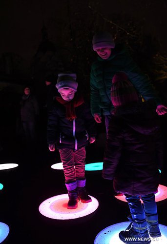 Children step on illuminated installations during China Light Festival at Cologne Zoo in Cologne, Germany, on Jan. 3, 2019. The festival is held here presenting more than 50 lights from Dec. 8, 2018 to Jan. 20, 2019. (Xinhua/Lu Yang)