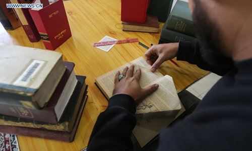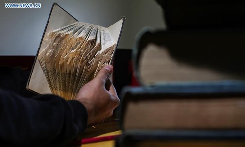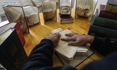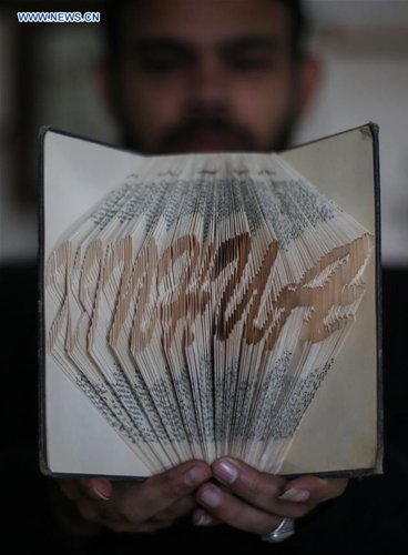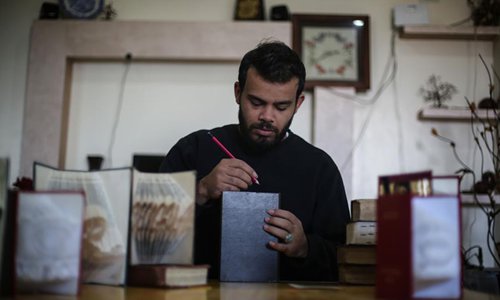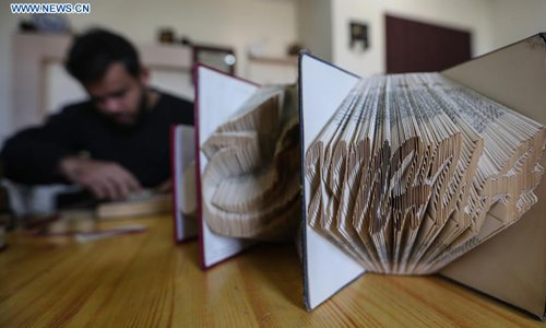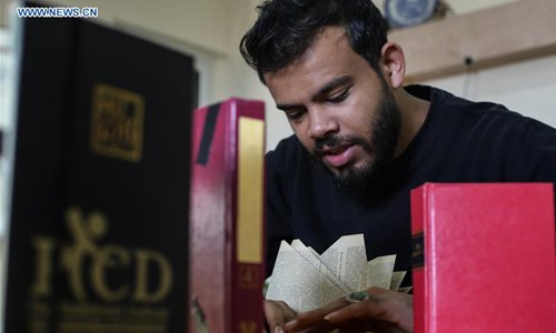 Ahmed Humaid, 28, folds paper sheets to creat shapes and words inside his house in Nusseirat refugee camp in the central Gaza Strip, on Dec. 31, 2018. A jobless Palestinian young man from a refugee camp in the Gaza Strip finds a creative way to fight unemployment by learning Origami, or the art of paper folding, online. (Xinhua/Stringer)