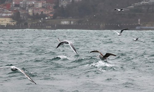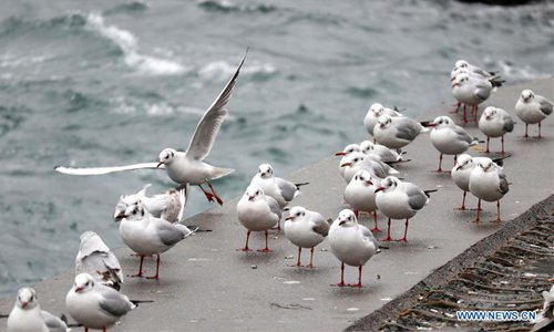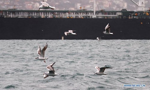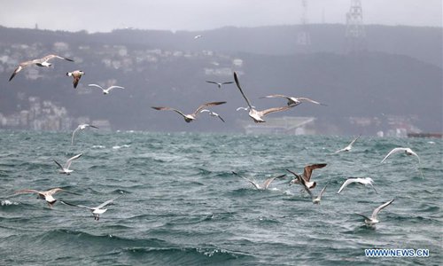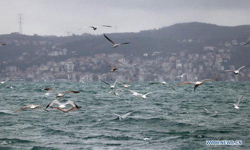 Seagulls are seen at Bosphorus Strait in Istanbul, Turkey, Jan. 4, 2019. (Xinhua/Xu Suhui)