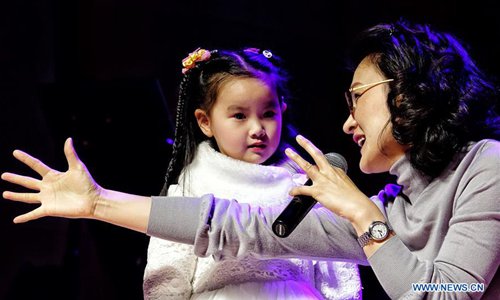 A hostess (R) interacts with a five-year-old child wearing the cochlear implant during a musical concert in Beijing, capital of China, Jan. 4, 2019. A special concert was held here on Friday to call for more attention to children with hearing impairment. (Xinhua/Li Xin)